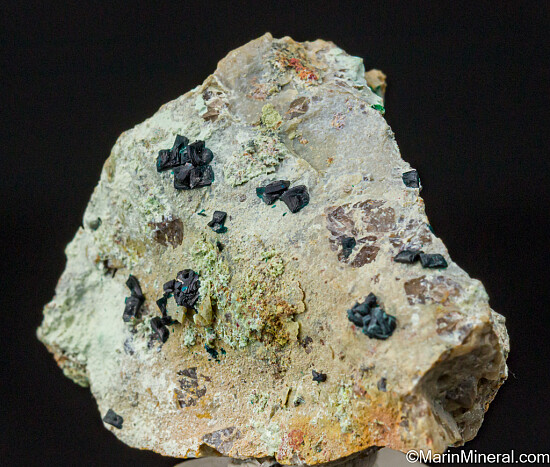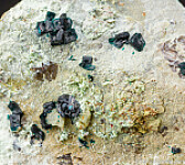 Deep blue crystals of Clinoclase over green Cornubite from the now defunct Majuba Hill Mine. Thick, chunky crystals with deep Navy blue color characteristic for this area of the mine. Great color and great crystals, valued at $150.