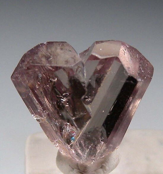 V-twin crystal of color change Diaspore. From new finds in the mountains near Milas, these new Diaspore crystals are spectacular in color and form. Glassy, flat termination faces on both 'arms'. Good V form, complete all around and undamaged for a tiny contact at the very bottom tip and along a back edge. Gem quality flawless and transparent inside. Medium purple color in natural sunlight. Superb gem crystal!! Having seen so many of the larger ragged-edged Diaspore crystals of yellow green color over the years, it's amazing and refreshing to see such perfect terminated crystals with V form.