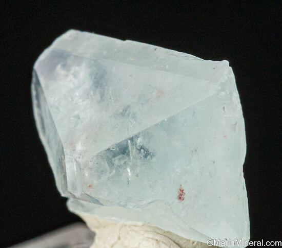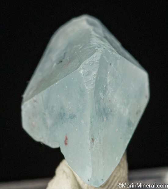 Double-terminated sky blue Topaz crystal from the famous St. Annes pegmatite. This locality is best known for a limited production of blue Topaz and blue Euclase. It's a transparent gem crystal and complete all around and undamaged with natural indentations on part of one side.