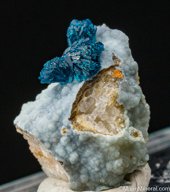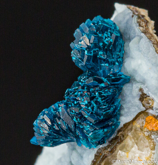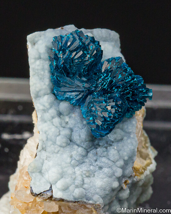 Veszelyite from ANYWHERE are rare and desireable. Beautiful curving radial clusters of vivid blue Veszelyite crystals atop light blue Hemimorphite. The crystal group is 9mm wide. This is from a new find made in July 2020 at an old Zinc mine located about about 400 kilometers away from previous Veszelyite finds made at the Laochang Mine (also in Yunnan Prov.).
