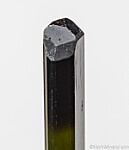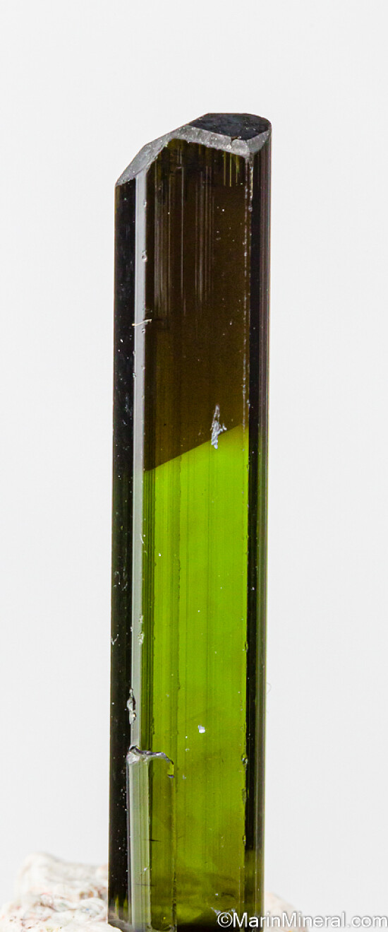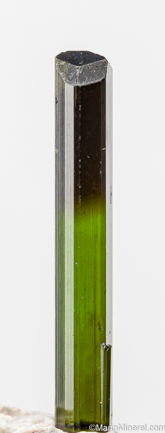 Gem Tourmaline crystal recently mined in the Karoi district of Zimbabwe. Fully terminated, complete, and undamaged. It's transparent top to bottom with a good medium green color over most of the crystal with a darker green (though still transparent) termination. The termination is multi-faceted and complex.