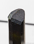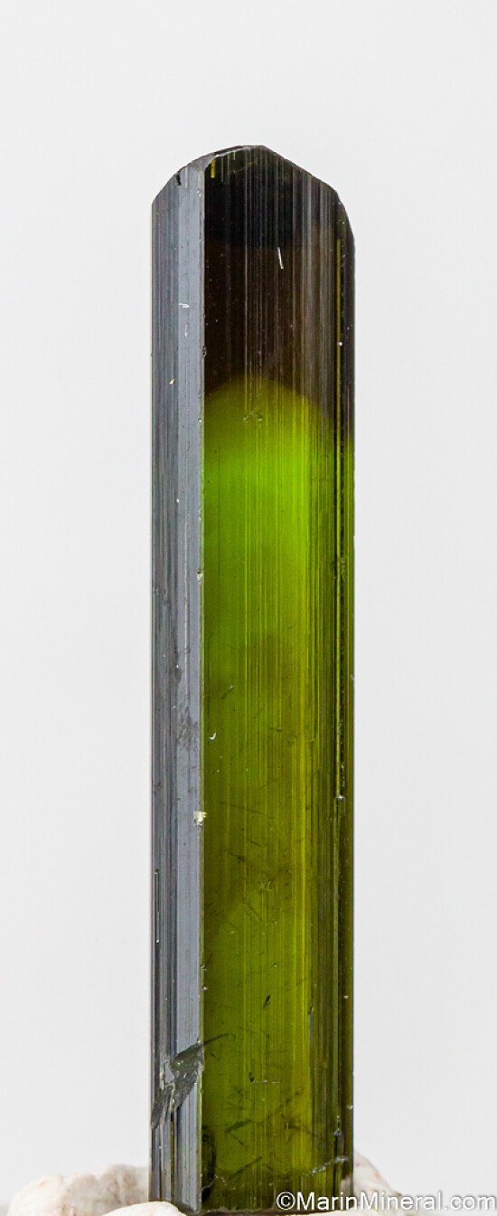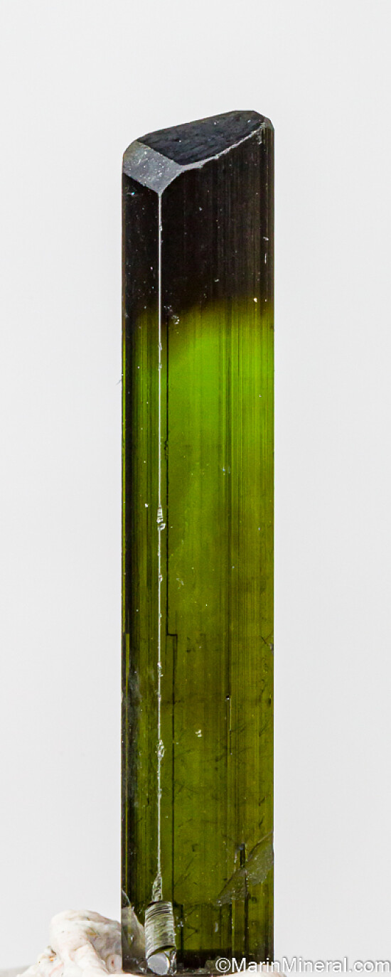 Gem Tourmaline crystal recently mined in the Karoi district of Zimbabwe. Fully terminated, complete, and undamaged. It's transparent top to bottom with a good medium green color over most of the crystal with a darker green (though still transparent) termination. The termination is multi-faceted and complex.