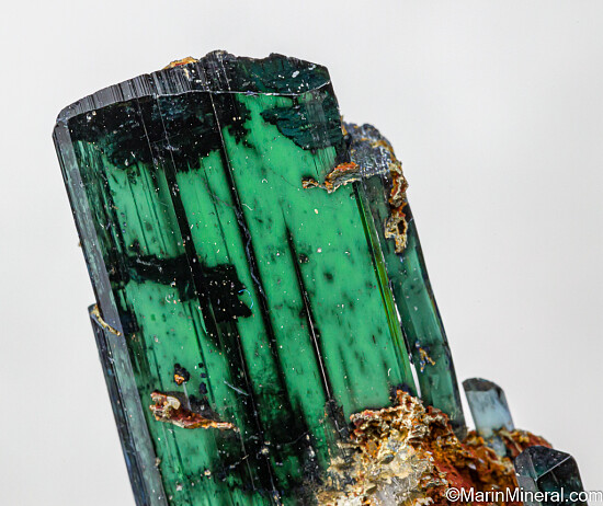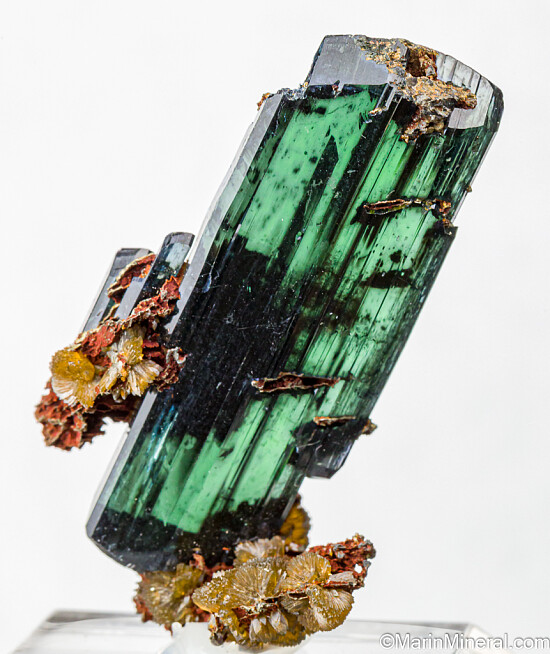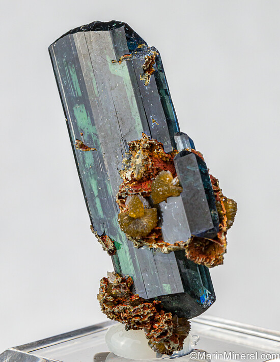 Transparent blue/green double-terminated Vivianite crystal with attached radial crystals of Siderite. Complete all around and undamaged. This one has it all - great color, transparency, and double-terminated form which is uncommon.