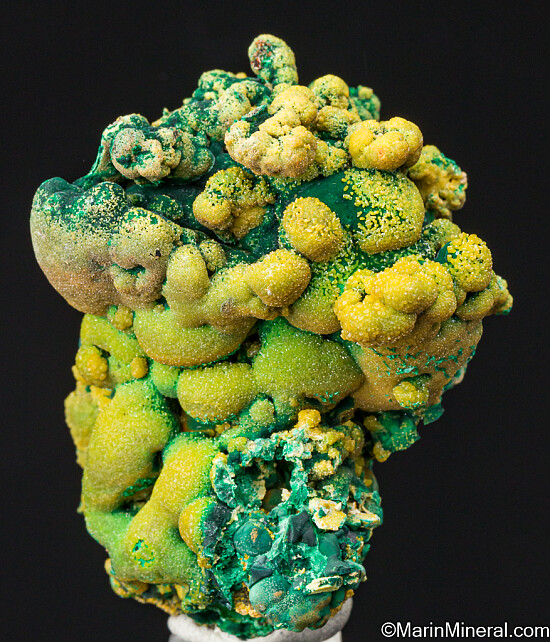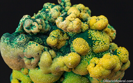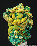 Globular Malachite partially coated by golden Pyromorphite crystals. Mineralogical interesting and colorful specimen with an 'organic' look to it.