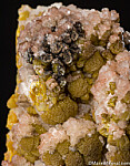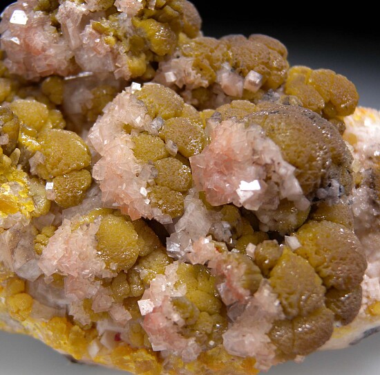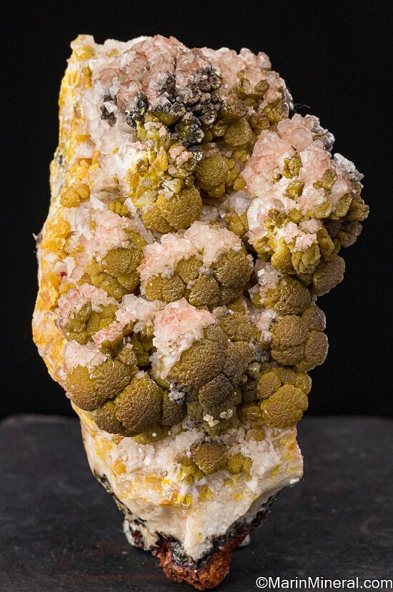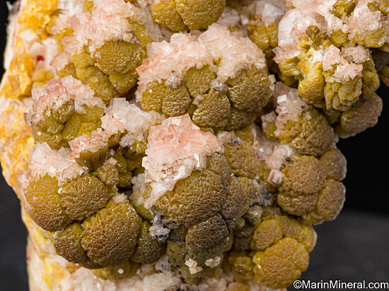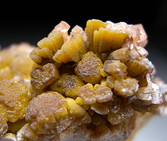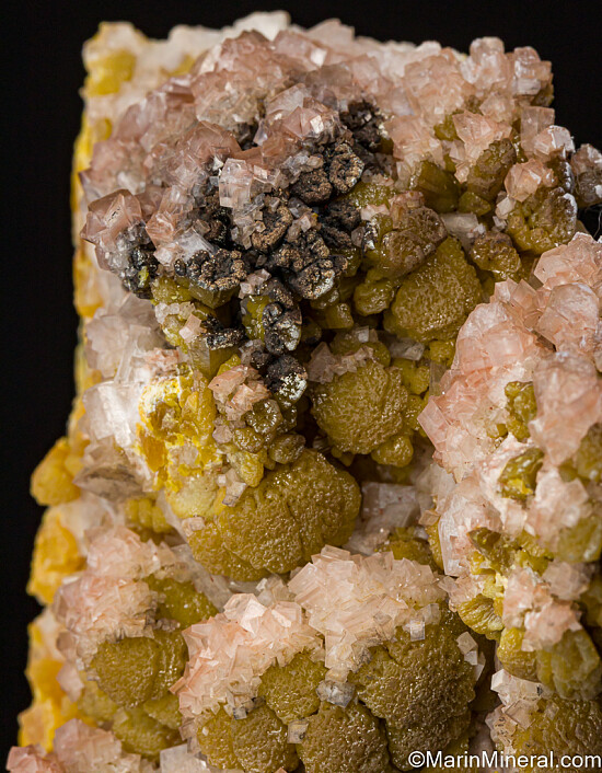 Deep yellow mounds of Mimetite partially covered by Calcite crystals from a lesser known Mexican Mine that produced these specimens decades ago (1950s). Some of the mounds show growth on top of more hexagonal, barrel-shaped crystals of the same color, distinctly Pyromorphite-like in form. There are also areas with black Plattnerite on the Mimetite.