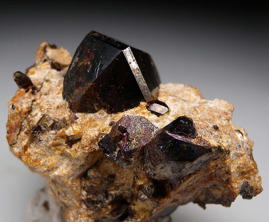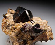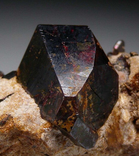 A robust 2.3cm Rutile crystal in Pyrophyllite with other smaller Rutile crystals. Collected long ago from the now closed Champion Mine in the remote White Mountains of California. The main crystal is thick and undamaged, dark with hints of red coloration, and especially sharp for the locality.