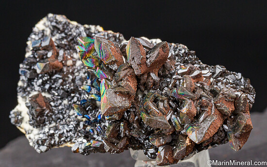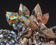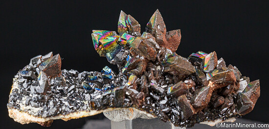 Well defined, spikey 'spear point' Descloizite crystals covering a thin matrix. The central star cluster displays crystals sticking out in all directions and rainbow iridescence. Undamaged with much more character than most.