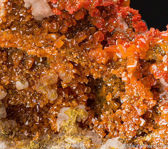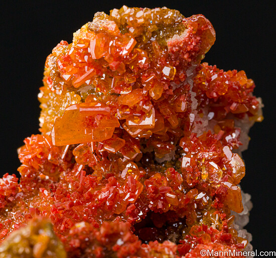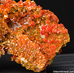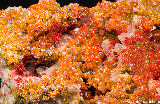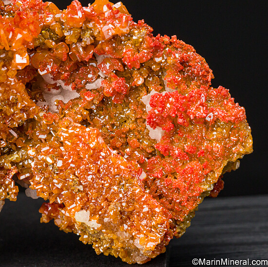 Colorful, well crystallized specimen composed of white Calcite covered by orange Wulfenite partially covered by red Vanadinite. The Wulfenite are bright and lustrous with crystals mostly in 3-5mm size range with some crystals up to 1cm. Big and showy, loaded with crystals all over, including the back which is mostly white Calcite crystals. Comes with an old Lidstroms label.