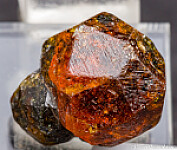 Two interconnected Spessartine crystals. Complete all around and undamaged, these have gemmy transparent areas of deep citrus orange color. These are most commonly found as partial crystals so a perfect, complete intergrown pair is exceptional. These caused quite a stir in the mineral community when they were first discovered and commanded very high prices. While prices have come down since the initial discovery, it's still a $300 specimen.