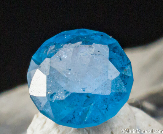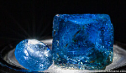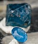 Rough and cut set of transparent blue Gahnite. Gahnite is the zinc rich end member and one of the rarer species in the Spinel group of minerals. The crystal is a complete octahedron with one tiny chip on one tip, otherwise perfect and translucent to transparent internally. The gemstone is a round just over 3mm wide. These were first discovered in 2001 and are found mostly of industrial quality. Though they don't get very large, the color is spectacular. The GIA has written a nice article about these crystals published in Gems & Gemology, Fall 2019, Vol. 55, No. 3.