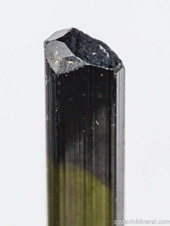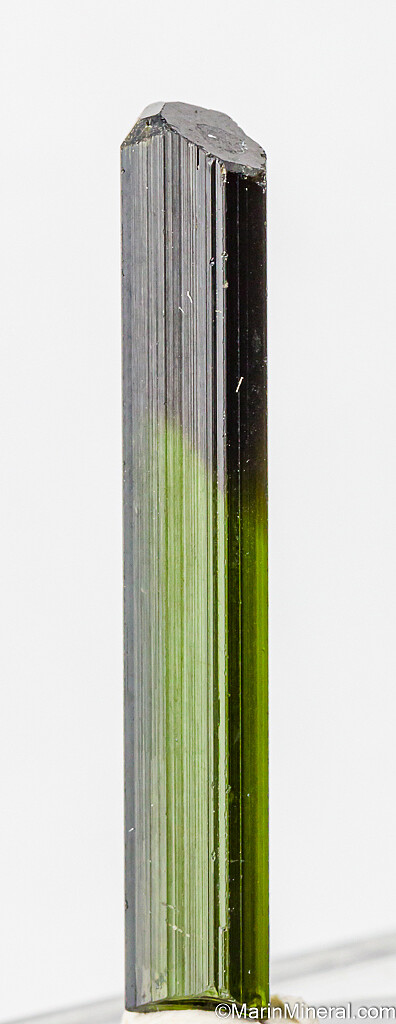 Gem Tourmaline crystal recently mined from the famous St. Anne's Mine in the Karoi district of Zimbabwe. Fully terminated, complete, and undamaged except for some slight edge chipping. It's transparent top to bottom with a good medium green color over most of the crystal with a darker green (though still transparent) termination. The termination is multi-faceted and complex. Excellent quality Tourmaline.