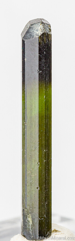 Gem Tourmaline crystal recently mined from the famous St. Anne's Mine in the Karoi district of Zimbabwe. Fully terminated, complete, and undamaged. It's transparent top to bottom with a good medium green color over most of the crystal with a darker green (though still transparent) termination. The termination is multi-faceted and complex. Excellent quality Tourmaline.