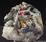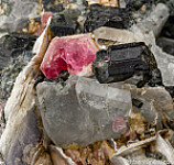 Uncommon matrix Pezzottaite specimen featuring a 6mm crystal of Pezzottaite set in Albite, purple Lepidolite, and Tourmaline crystals. The Tourmaline have dark outer rinds with translucent red cores. A rarity.