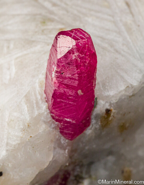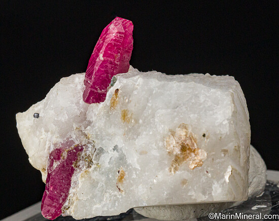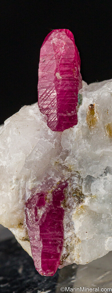 Translucent red Ruby crystals in matrix. The two Ruby crystals are aligned and separated by a small amount of matrix, but give the effect of a single crystal with a 'sword-in-stone' look. The distance tip to tip of the two crystals is 3.2cm. Ex. Jon Sigerman collection.