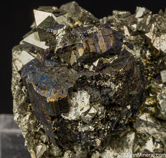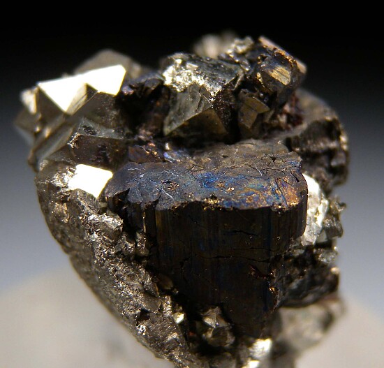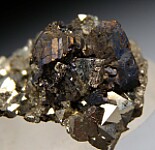 Bournonite crystal group of Pyrite from recent finds in Bolivia. The Bournonite cluster is 1.5cm wide and intergrown with Pyrite. The Pyrite are fantastic with high luster and octahedral form.