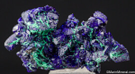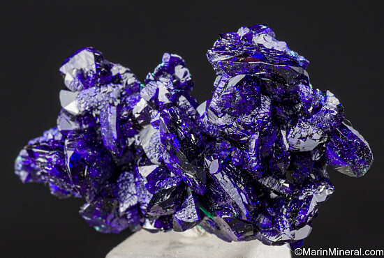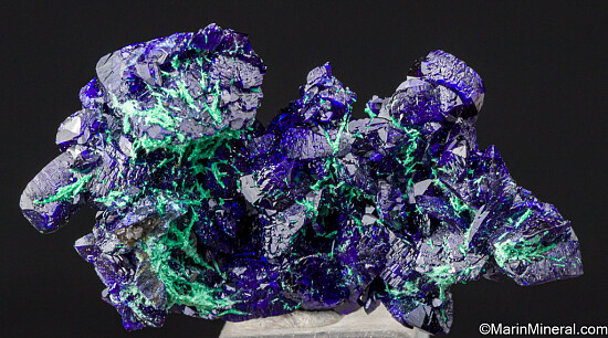 A group of interconnected Azurite crystals with little stringers of 'spider-web' Malachite attached to the backside. Floater cluster composed of double-terminated crystals. Great, characteristic specimen from the watercourse pocket. Undamaged with highly lustrous crystals all over - nothing but great crystals!