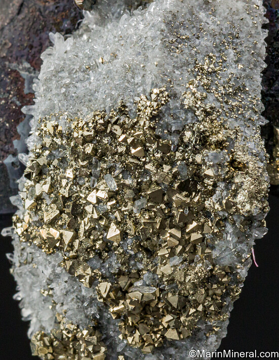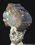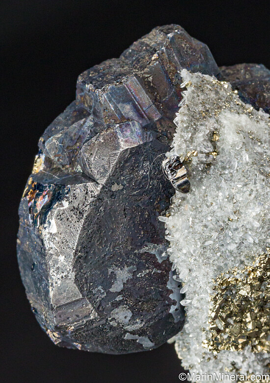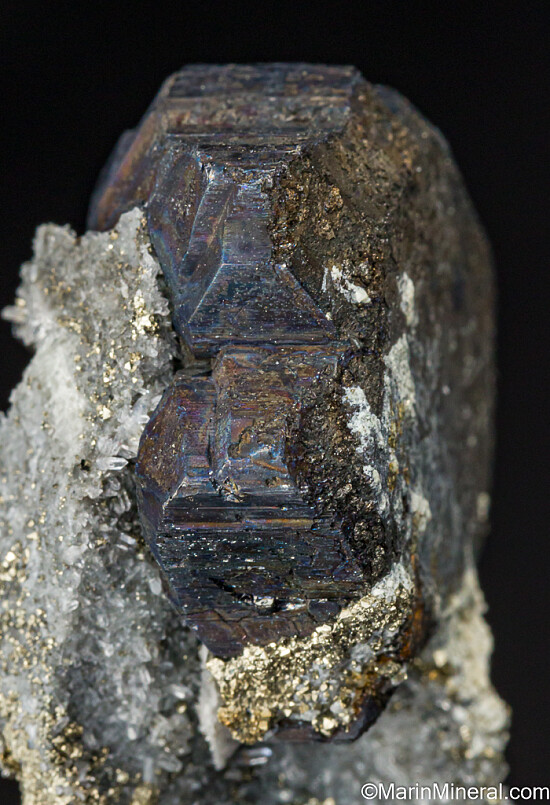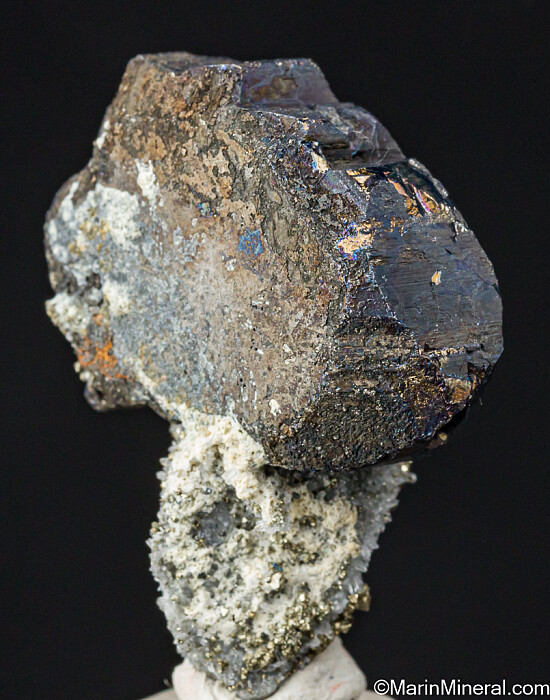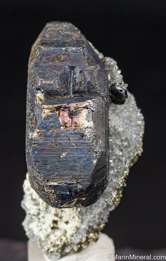 Large single Bournonite crystal 3.5cm wide from recent finds in Bolivia. The Bournonite crystal has a dark patina and classic 'cogwheel' form. Complete and perfect with some edge chipping. Presents perfectly on a small amount of matrix. The matrix is covered by tiny Quartz crystals and shiny Pyrite crystals making it visually exciting from any side. This is just how I received it, and the metallic luster could possibly be improved with cleaning. Valued at $150 as is.