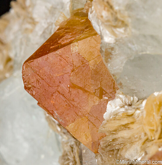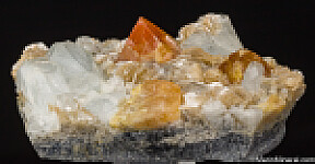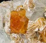 Vibrant orange Scheelite octahedra to 2cm wide on Muscovite with tabular Aquamarine crystals.