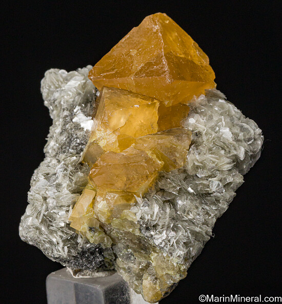 Transparent to translucent Scheelite octahedra to 2.2 cm on Muscovite. Aesthetic stacked group of crystals.