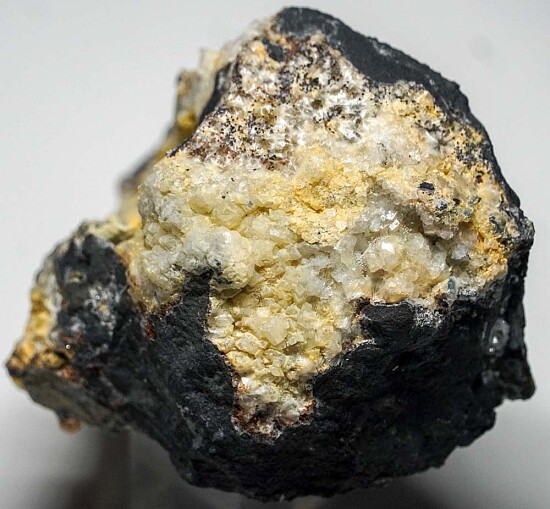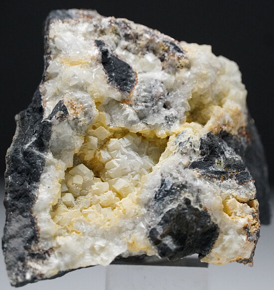 Shallow vugs loaded with Fluellite crystals and radial groups of Wavellite. This piece is loaded with Fluellite crystals! Most vugs were barren of Fluellite or only had occasional individual crystals. The vugs onthis specimen are covered in crystals. Fluellite is a rare phosphate mineral and the world's best were found at this old Gold mine in Nevada. Mined by Dan Evanich.