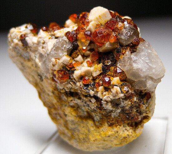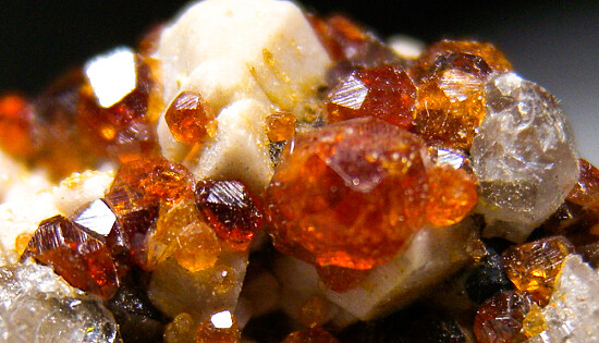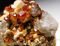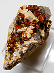 Orange/red Spessartine crystals on matrix from Tongbei. The garnets are gemmy and bright and occur with tan Orthoclase and Quartz crystals.