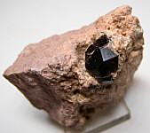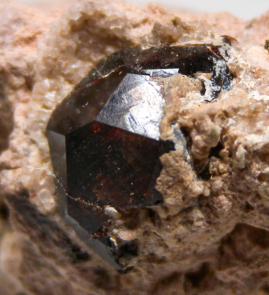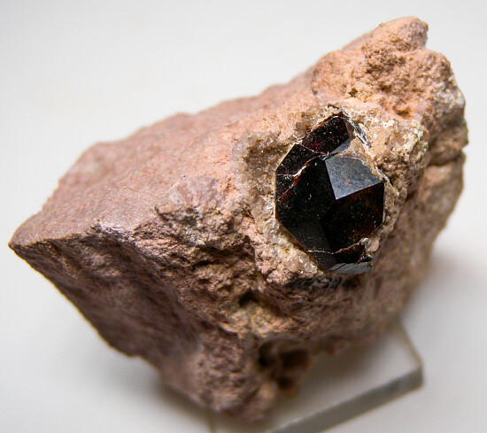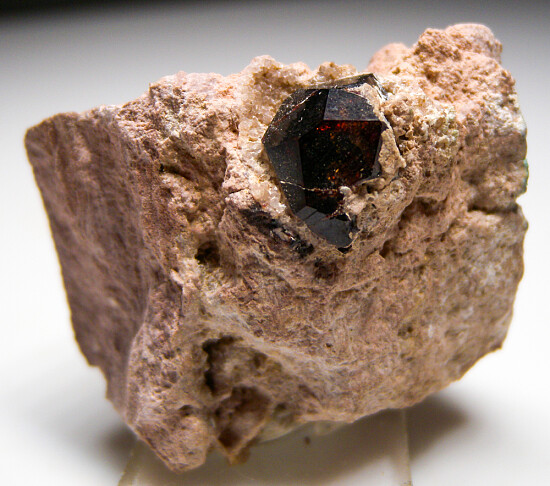 Deep wine red Spessartine crystal on pink Rhyolite from the famous Garnet Hill locality located just north of Ely, Nevada. The garnet is 13mm in size and in perfect condition.