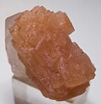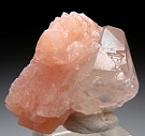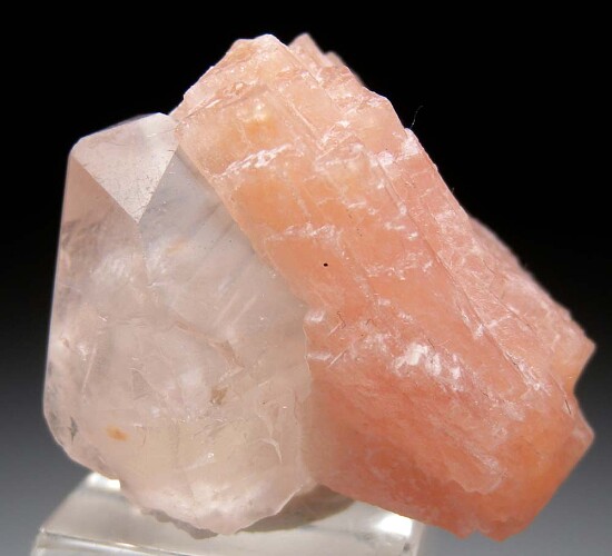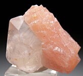 Translucent, doubly-terminated peach colored Olmiite crystal attached to a transparent Calcite crystal. Superb and rare combo forming a great thumbnail sized specimen.