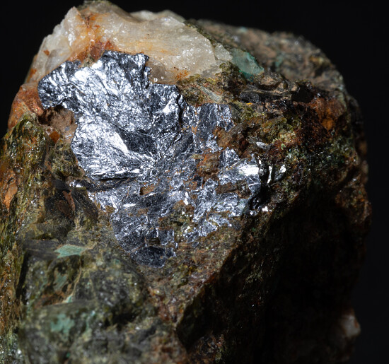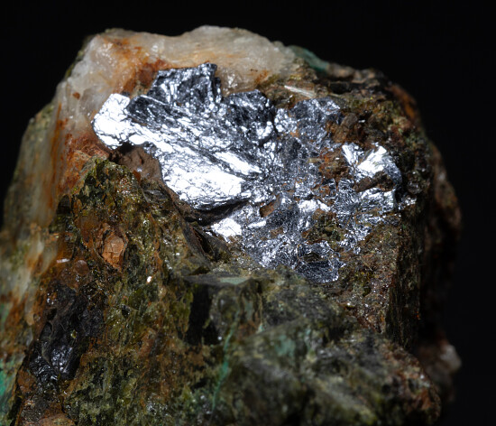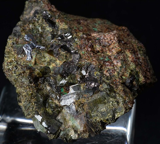 Shiny, silvery metallic crystals of Molybdenite in an Epidote and Andradite rich matrix.