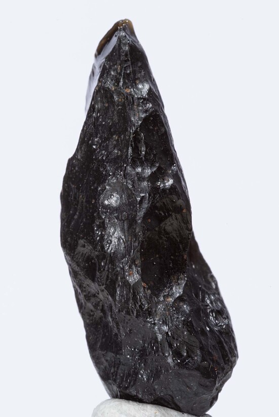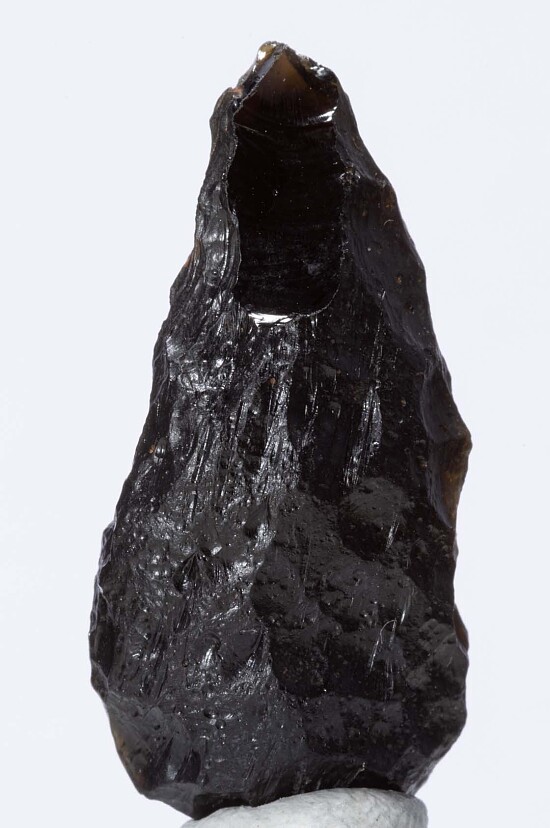 Tear-drop shaped Tektite with interesting form and typical surface pitting. Tektites are natural glass formed from terrestrial debris ejected during meteorite impacts. Ex. Chuck Trantham collection.