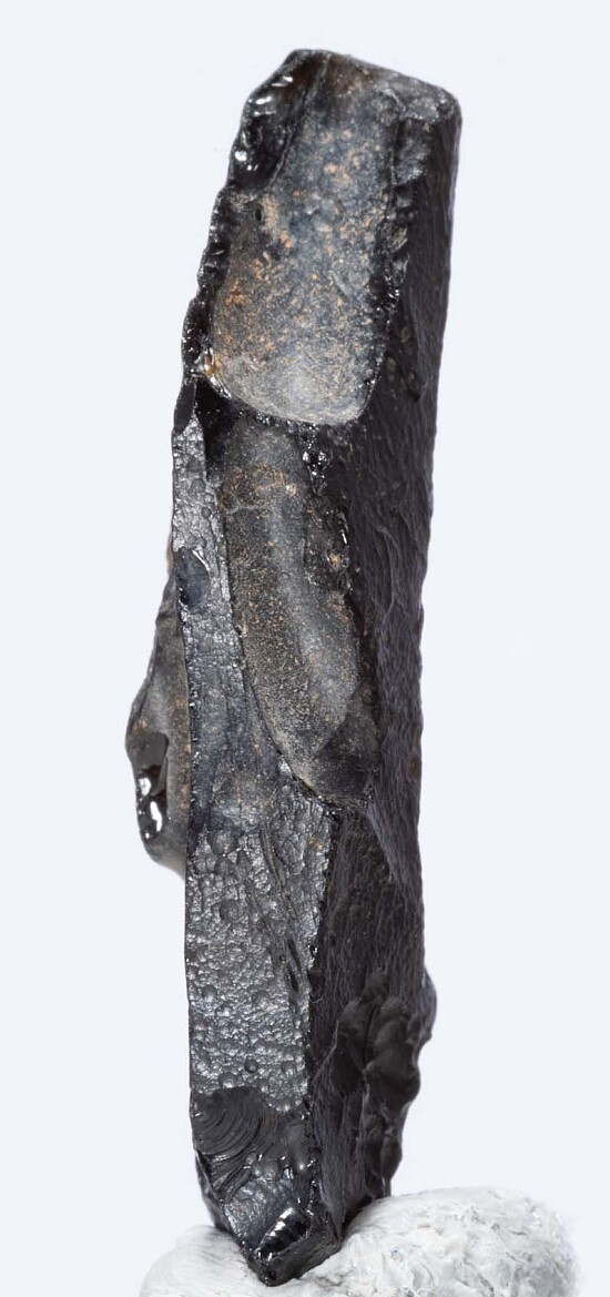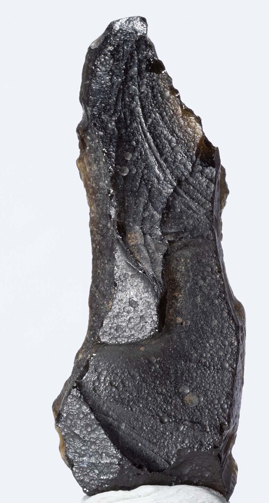 Translucent Tektite with typical surface pitting from Thailand. This one is elongated with unusual form. Tektites are natural glass formed from terrestrial debris ejected during meteorite impacts. Ex. Chuck Trantham collection.