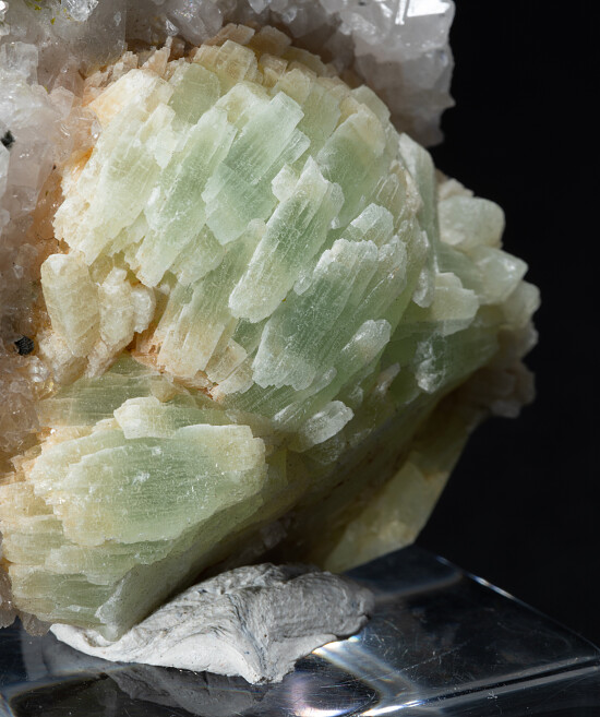 Spherical clusters of green Prehnite crystals atop drusy Quartz crystals.