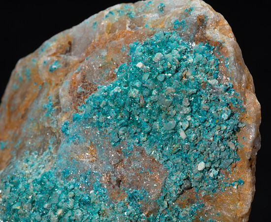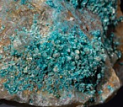 Bright blue/green crystals of Botallackite on matrix. Botallackite is a rare copper oxychloride and can form where Copper ore meets saltwater. At the Cligga Mine, the Copper ore body extends out to the edge of cliffs along the ocean where the Botallackite formed.