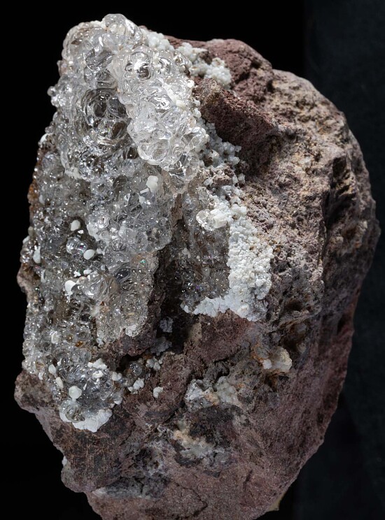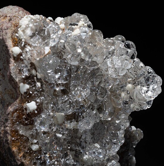 Transparent botryoidal Hyalite and white Staffelite (carbonate rich fluorapatite) on matrix. These are old classics from themost famous locality in the world for Hyalite. This specimen has thick layers of bubbly transparent Hyalite with areas of white Staffelite.