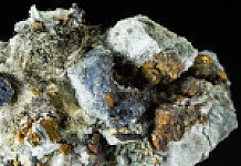 GGolden metallic needles of Millerite in Calcite along with Chalcpyrite in multiple drusy Quartz lined vugs. Abundant Millerite in many areas of the specimen. Ex. Tim Sherburn collection from Robert Lawson. Found in 1994.