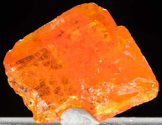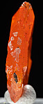 Bright orange/red crystal of Red Cloud Wulfenite. The crystal has glassy high luster and the great color that made this mine famous. There are transparent sections in the crystal. Crystallized all around, possibly a flaoter, with a couple small chips otherwise undamaged.