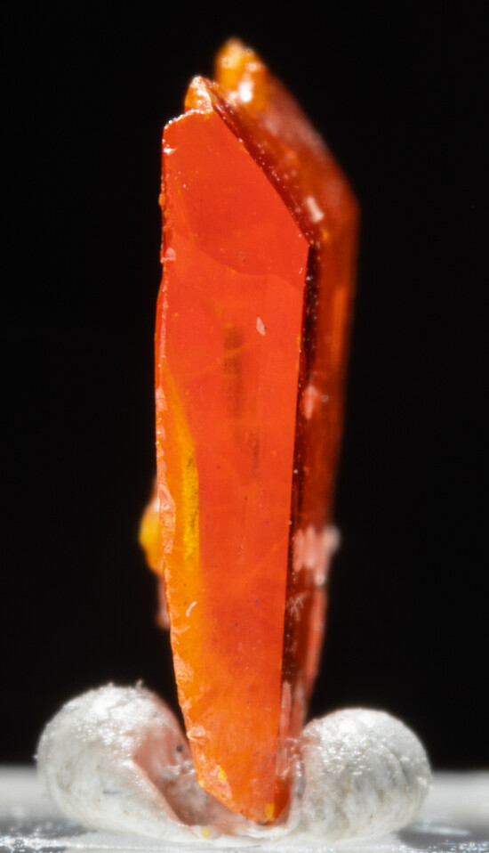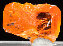 Bright orange/red crystal of Red Cloud Wulfenite. The crystal has glassy high luster and the great color that made this mine famous. There are transparent sections in the crystal. In good condition, crytallized all around, with some edge chipping.