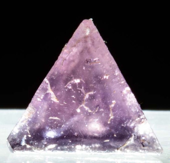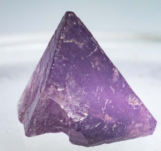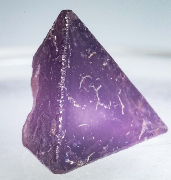 Tetrahedral crystal of Chambersite, a rare mineral found in salt formations in a small number of localities worldwide. Translucent 'Amethyst' purple in color and collected by Fred Pough in 1970. This is a complete crystal - though one termination is cavernous, the edges of the indentation are fully crystalized and terminated. Ex. Chuck Trantham collection.