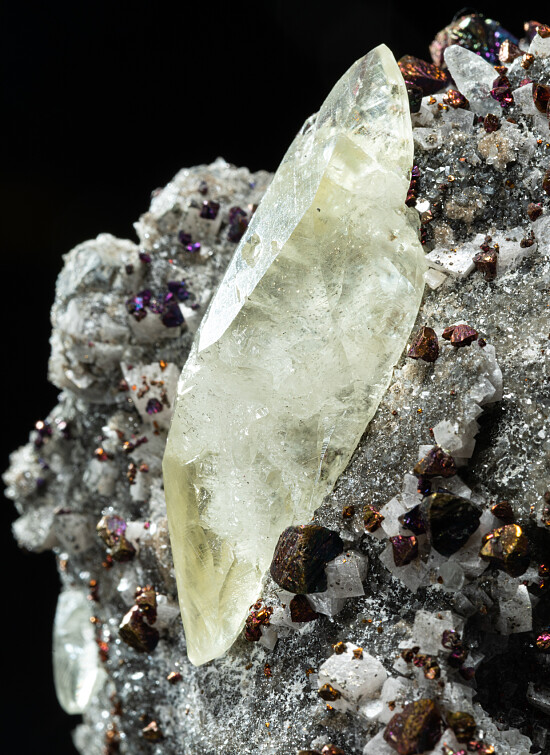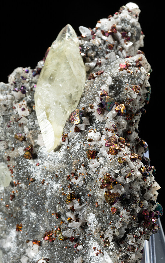 Beautiful 4.4cm doubly-terminated Calcite crystal on matrix covered with Dolomite and Chalcopyrite crystals. The main Calcite is gemmy, glassy, and in perfect condition, and there are other smaller Calcites present. There are good crystals on both front and back. The Chalcopyrite crystals have a colorful irridecent patina. Large and stunning display specimen.
