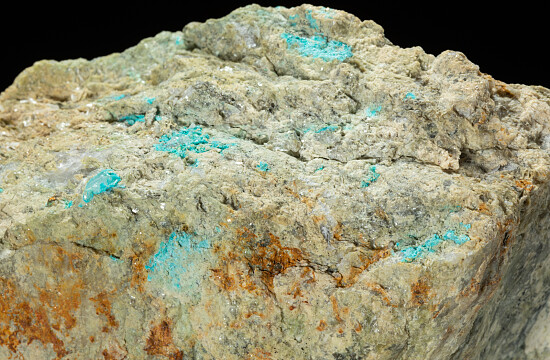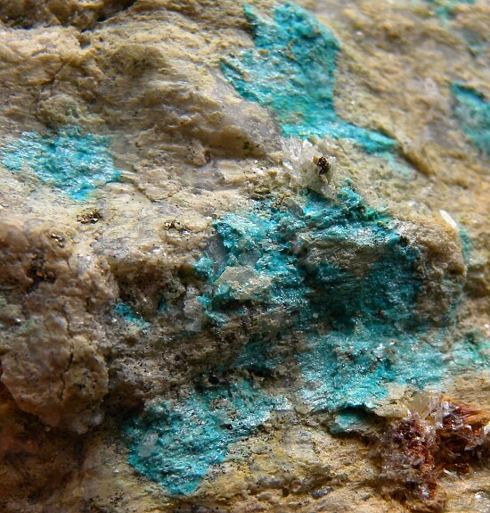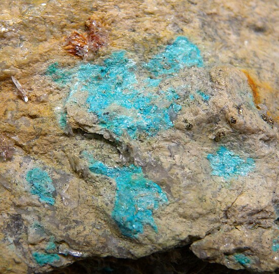 Blue Orthoserpierite showing in multiple sides of a tan rock matrix. Orthoserpierite in an uncommon copper sulfate mineral in the Devilline group with a Type locality of Chessy, France. Ex. Tim Sherburn collection from Robert Lawson in 2013.
