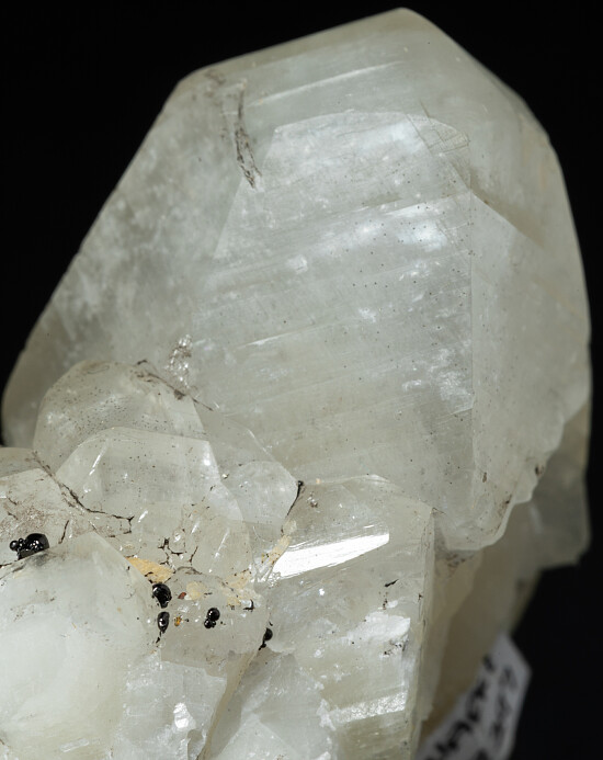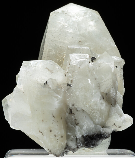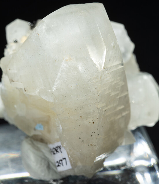 Scalenohedral white Calcite crystals from the Abbeytown Quarry. The main crystal has a clearer outer layer and pearlescent reflections internally and is in perfect condition. Ex. Tim Sherburn collection. Acquired from Peter Briscol in 2002.
