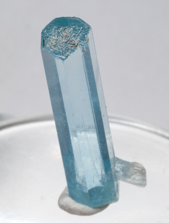Single well terminated gem quality Aquamarine from Vietnam. Perfect and undamaged with slight etching on some termination faces. The crystal is facet quality transparent for it's entire length and has the great blue color Vietnamese Aquas are known for.