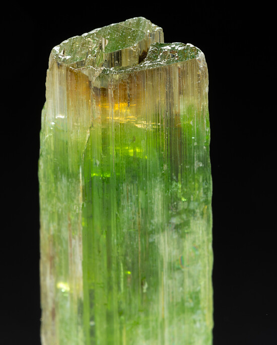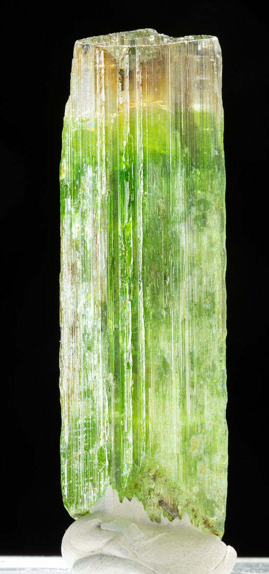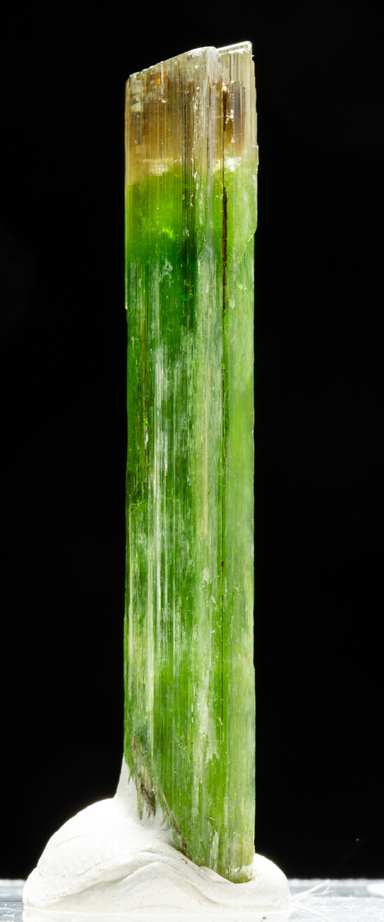 Elongated, gemmy single Tremolite crystal from the Merelani Tanzanite mines. This is larger than average with a vibrant green color and a perfect flat termination. Complete all around and undamaged, even the bottom is rehealed.