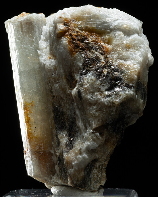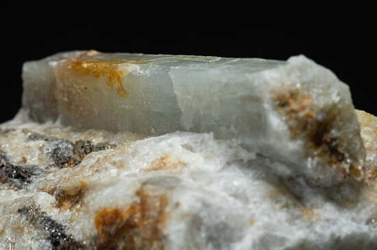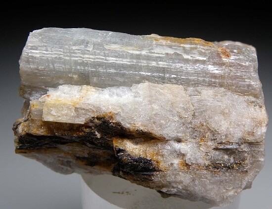 Translucent greyish crystals of Sillimanite in matrix. These are found in pegmatites in cliffs near the village of Nibbio. The main crystal is 4cm long.