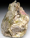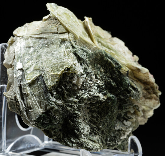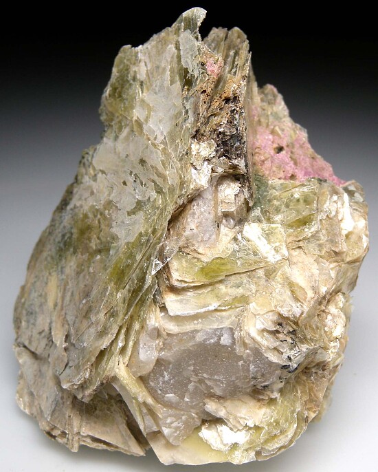 Pearlescent yellow-green Polylithionite crystals from the Type Locality in Greenland. Pink crystals of Eudialyte and small black Aegerine crystals are also present. Polylithionite is a rare mica species and this is an excellent large example with large platy crystals showing on all sides.