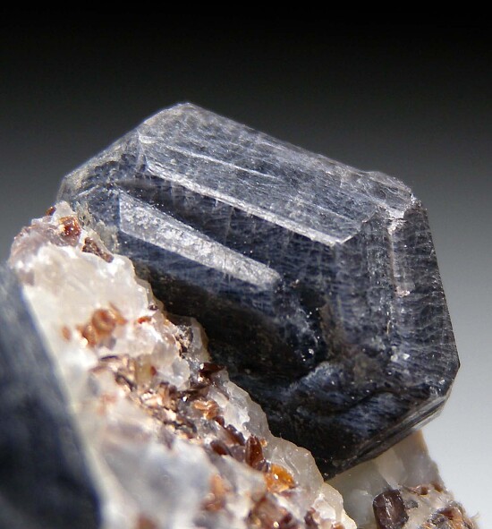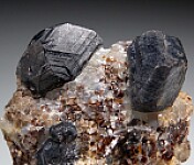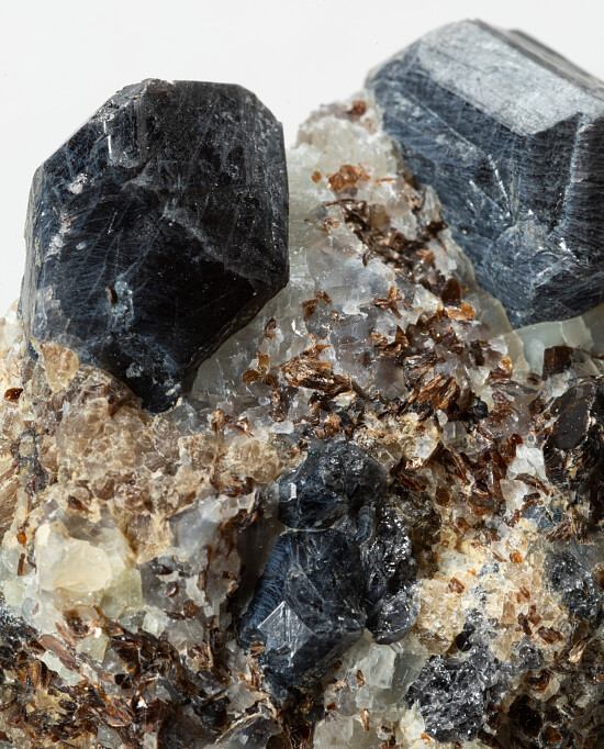 Well fomred crystals of Sapphirine exposed in a matrix of reddish Phlogopite, Quartz, and Calcite. There are two major crystals to 1.4cm in size and a number of smaller crystals. The Sapphirine are translucent when backlit along the edges. A rich and fine display specimen of this rare magnesium aluminum silicate mineral. Valued at $350.