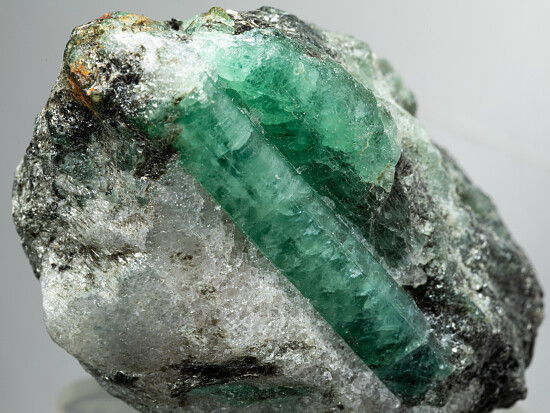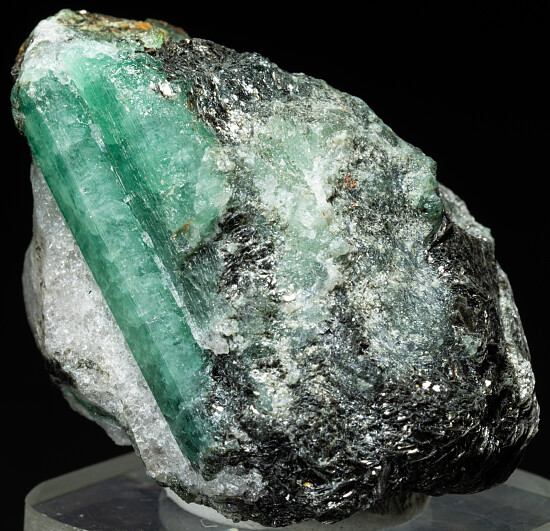 Multiple green Emerald crystals in a Calcite and Biotite schist matrix. The Emeralds have a pleasant medium green color and are translucent to transparent. The largest crystal is 2.5cm long. This locality is one of the world's oldest emerald deposits, having been mined here since 1927. Valued at $200.