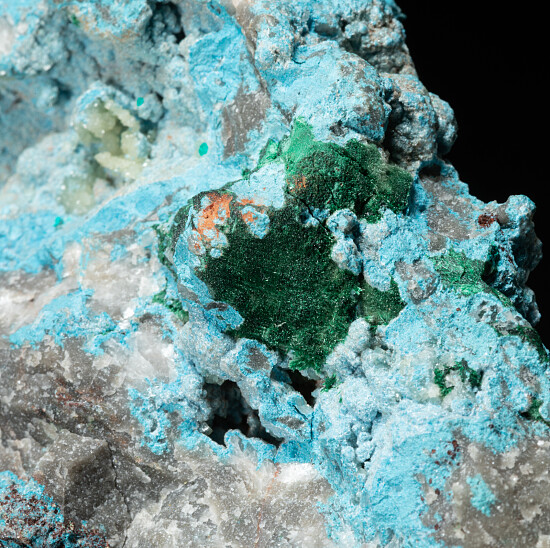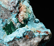 Light blue Plancheite with areas of Malachite, Dioptase crystals, and white Dolomite crystals. Comes with two old labels. Ex. H. Ruppe, W. Kuhlwetter collections.