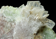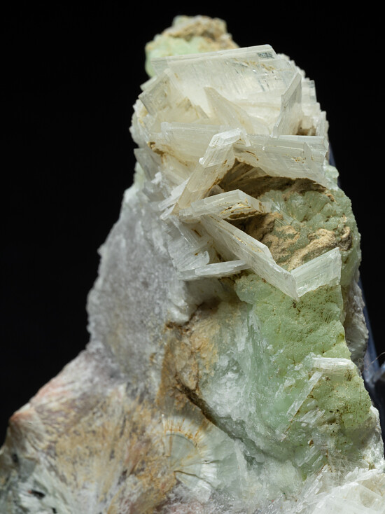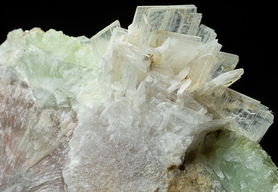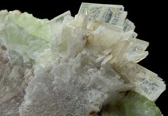 A rare form of window-pane Pectolite crystals with green Prehnite atop more typical radial clusters of Pectolite. This locality is an abandoned gabbro-diabase quarry, now on the site of a nature reserve where collecting is strictly prohibited (Mindat). These rare window-pane crystals reach 1.1cm in size. The rare mineral Julgodite is also present as small black crystals included within the radial Pectolite groups. This is a fabulous and uncommon specimen from an old collection and rare to find now.