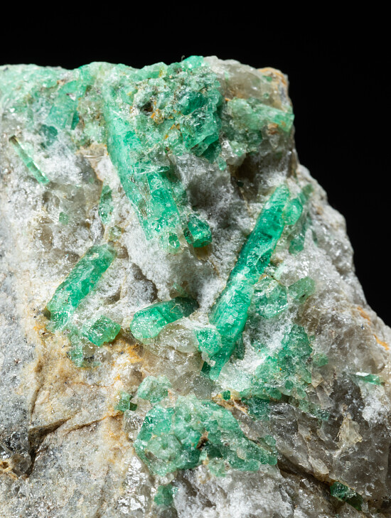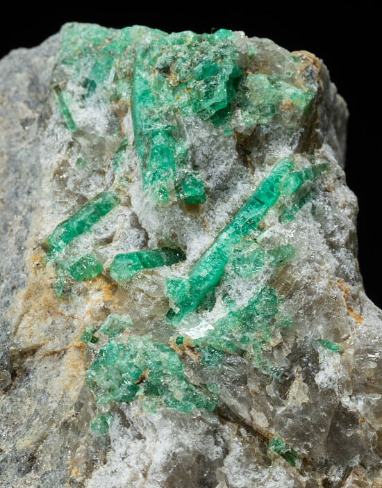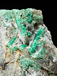 Emerald crystals to 1.5cm long in matrix from a historic Emerald mine in Norway. There a numerous good Emerald crystals in a group on a hard blue/grey rock matrix containing tiny disseminated Pyrite crystals.