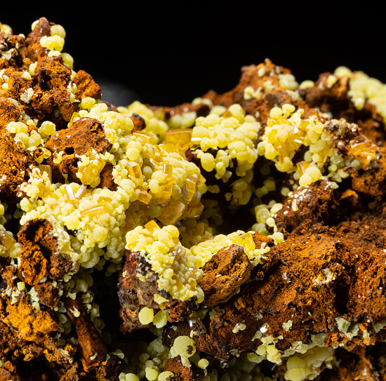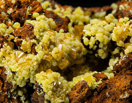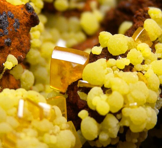 Globular yellow/green Mimetite all over a Limonite matrix with attached orange Wulfenite crystals, some of which are very transparent. Comes with a few old labels.